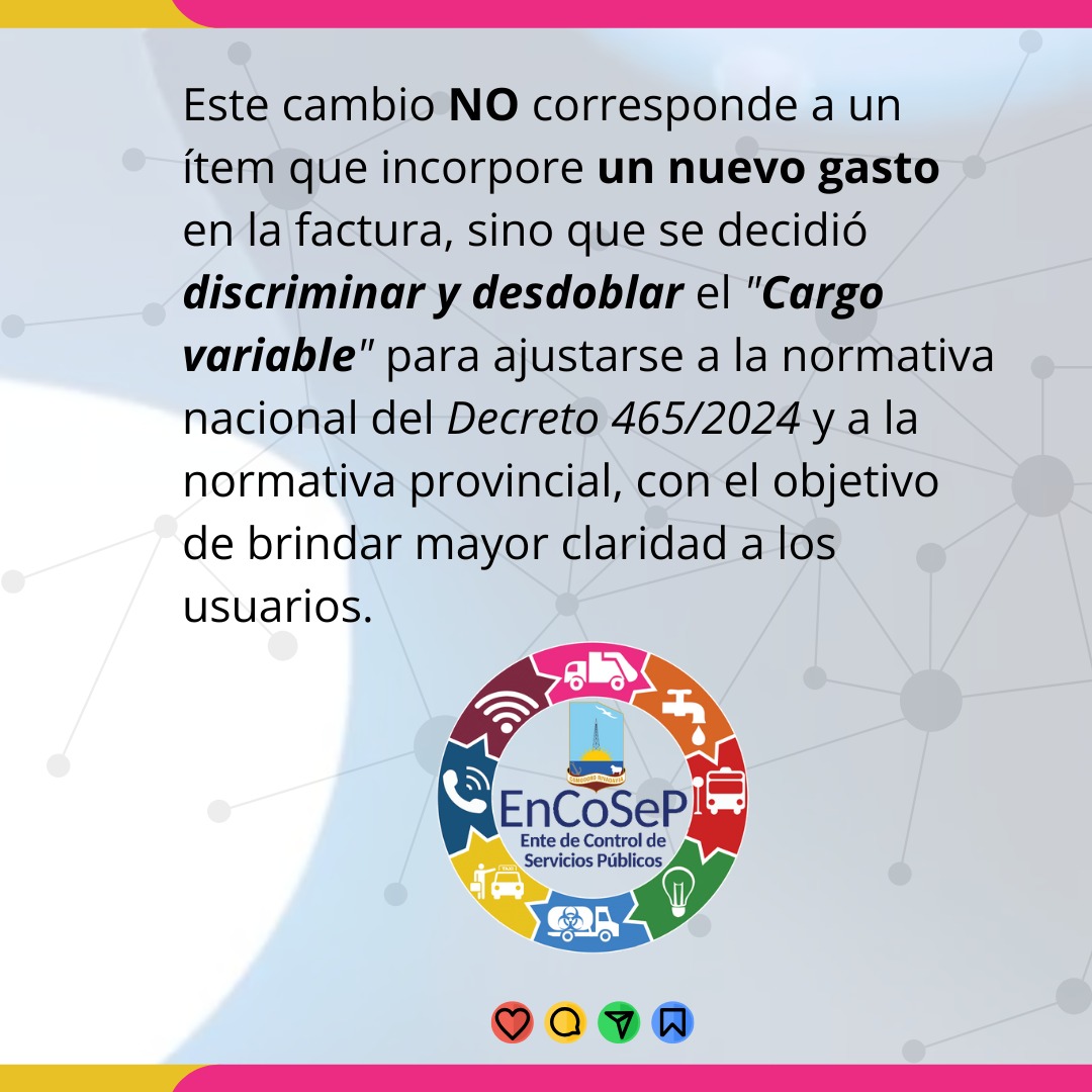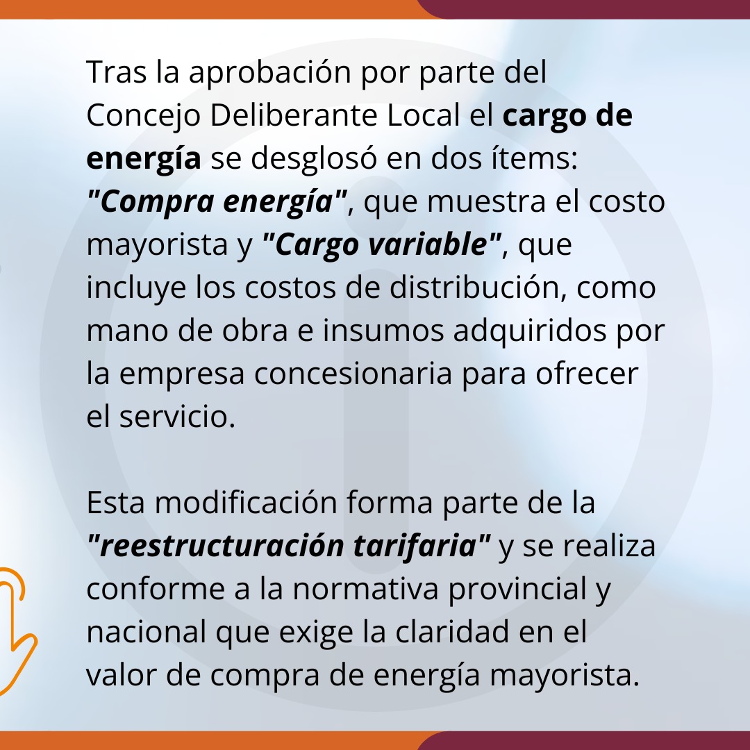 El Ente de Control de los Servicios Públicos informa que el denominado Ítem Energía es producto del desglose de montos económicos que ya se abonaban con anterioridad. En cumplimiento con el decreto nacional 465/2024 y con aprobación del Concejo Deliberante local ya comenzó a aplicarse el desglose de compra de energía y gastos variables en las boletas de servicios a partir de este último mes.